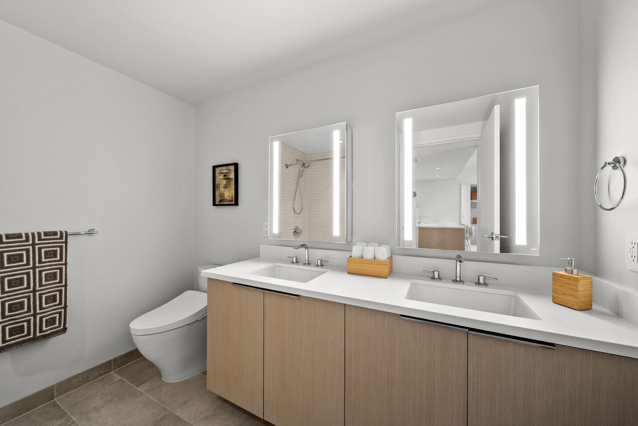 Light and bright engineered wood flooring, quality Studio Becker cabinetry, quartzite counter and vanity tops, stainless Bosch appliances, and Toto wash-lets and double sinks in both baths. Immaculately maintained in "Move In" condition.
