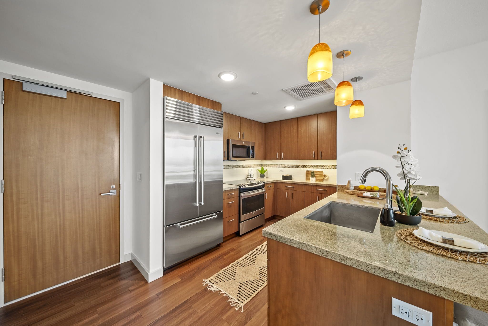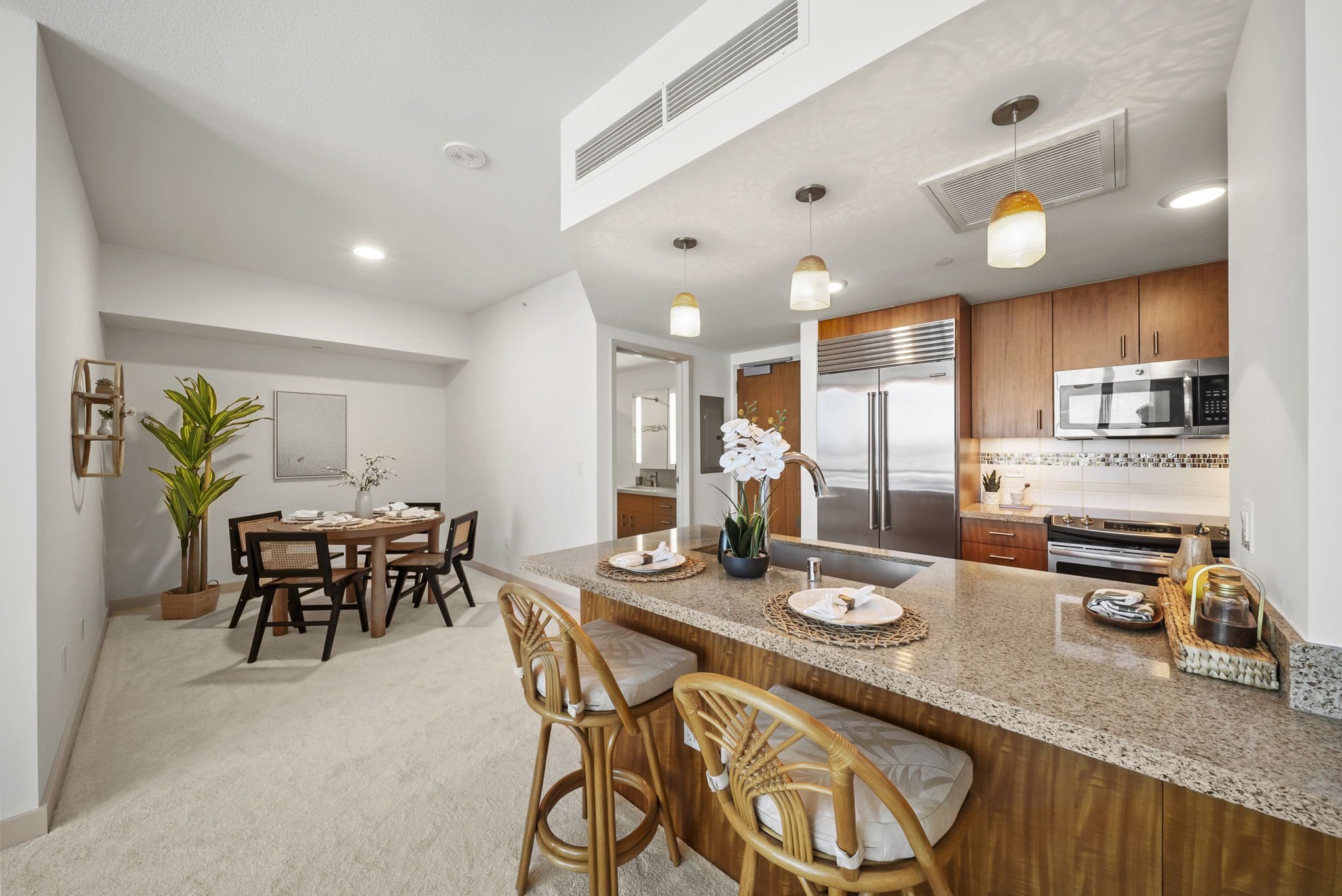 Well laid-out kitchen with casual dining counter for 2 or 3, quartzite counter-tops, all stainless appliances, soft close cabinets w/pull-out shelves and even a large pantry. Quiet Central/Split AC to keep you cool. New paint & carpet to boot!